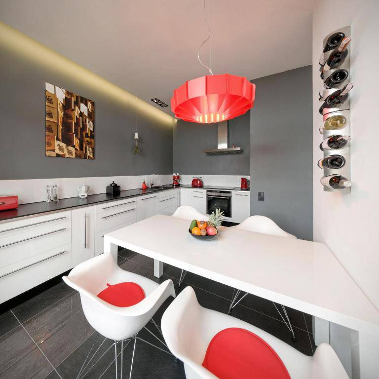 Apartament jest kompleksowo wyposażony, zapewniając Państwu wygodny pobyt. Komfort apartamentu, jego walory estetyczne oraz niezwykła lokalizacja są wysoko oceniane przez naszych Gości. Wnętrze apartamentu odznacza się designerskim wystrojem w kontrastujących kolorach czerni, bieli i czerwieni. Do dyspozycji Gości jest telewizor z płaskim ekranem i dostępem do kanałów telewizji satelitarnej, 2 sypialnie, część wypoczynkowa, jak również kompletnie wyposażony aneks kuchenny ze zmywarką do naczyń i ekspresem do kawy. W łazience znajduje się prysznic i suszarka do włosów. Cena zakwaterowania w apartamencie ST1 obejmuje bezprzewodowy dostęp do Internetu.