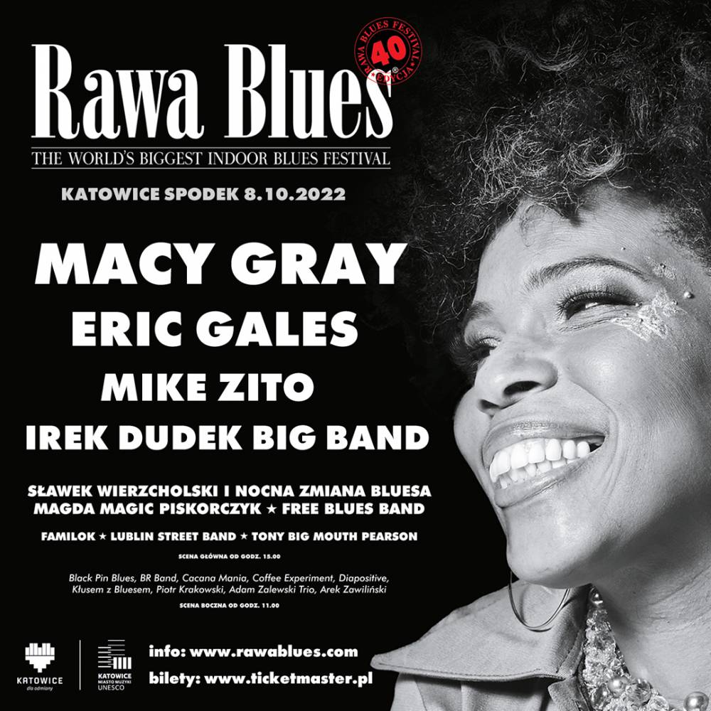 40 edycja festiwalu Rawa Blues odbędzie się 8 października w katowickim „Spodku”. Zagranicznymi gwiazdami imprezy będą: laureatka nagrody Grammy, obdarzona charakterystyczną barwą głosu wokalistka Macy Gray oraz znakomici gitarzyści - Eric Gales i Mike Zito. Rawa Blues to największy festiwal bluesowy indoor na świecie. Zdobywca nagrody Keeping The Blues Alive 2012.