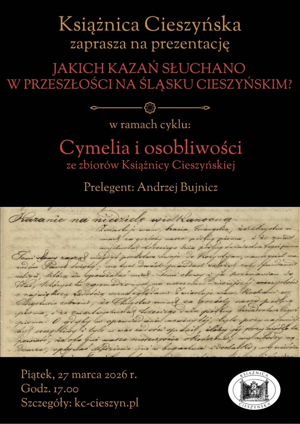 Zapraszamy na trzecie w 2026 roku spotkanie z cyklu „Cymelia i osobliwości ze zbiorów Książnicy Cieszyńskiej" : JAKICH KAZAŃ SŁUCHANO W PRZESZŁOŚCI NA ŚLĄSKU CIESZYŃSKIM? - poświęcone fascynującej historii regionalnego kaznodziejstwa. W XIX-wiecznym świecie, pozbawionym współczesnych środków masowego przekazu, to właśnie ambona była najważniejszym centrum komunikacji społecznej, edukacji i kształtowania postaw moralnych.