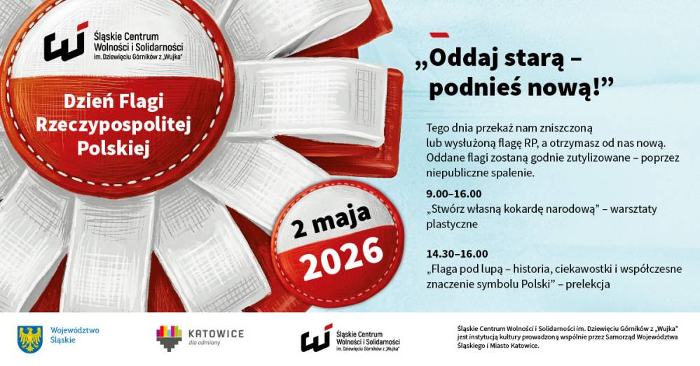 •  „Oddaj starą – podnieś nową!” Pod takim hasłem organizuje akcję, w ramach której można będzie wymienić swoją zniszczoną lub wysłużoną flagę RP na zupełnie nową. Zapraszamy do ŚCWiS w Dniu Flagi RP, 2 maja 2026 r., w godz. 9.00-16.00.