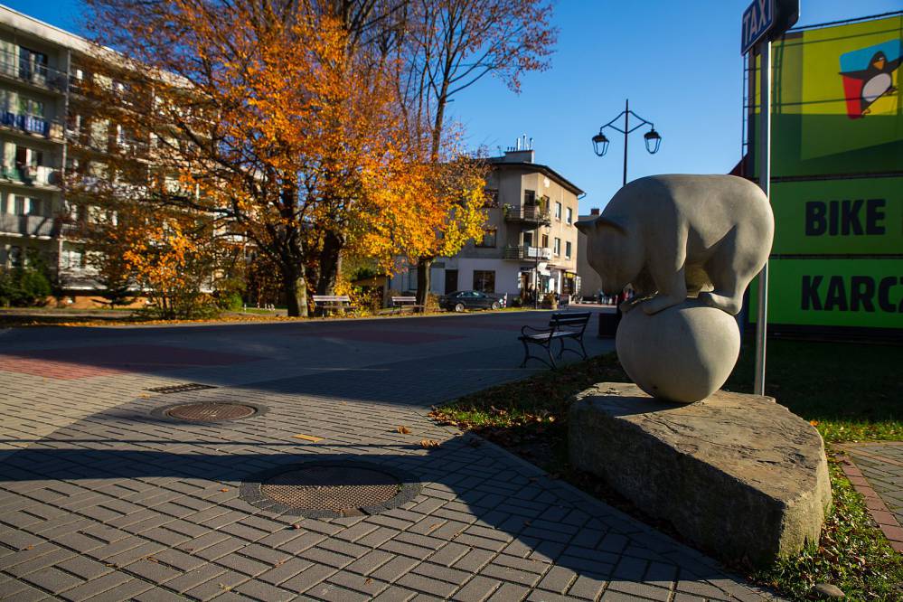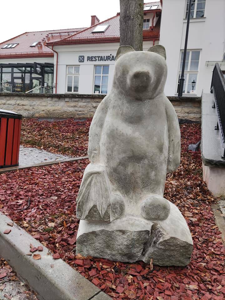 Kamienny miś na kuli powstał w 2017 r. i jest wiernym odwzorowaniem figury zlokalizowanej w Parku im. St. Kopczyńskiego. Rzeźba znajduje się w odległości zaledwie 280 m od wiślańskiego rynku - Placu Bogumiła Hoffa.