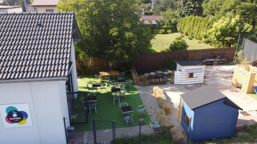 Na antresoli znajduje się strefa kawiarniano-warsztatowa. W ofercie gastronomicznej znajduje się prawdziwa włoska kawa, domowa lemoniada, przepyszne gofry i lokalnie wypiekane ciasta. W sezonie letnim dodatkową atrakcją jest Bombel Garden - ogród zabaw, gdzie znajduje się kuchnia błotna, domki, minikort, ścieżka sensoryczna i duży orzech, pod którym odbywają się nasze warsztaty. Rodzice mają możliwość usiąść na zewnątrz i napić się naszych orzeźwiających (bezalkoholowych) napojów: Bomberol Spritz (Aperol Spritz), Mojito, Espresso Tonic.