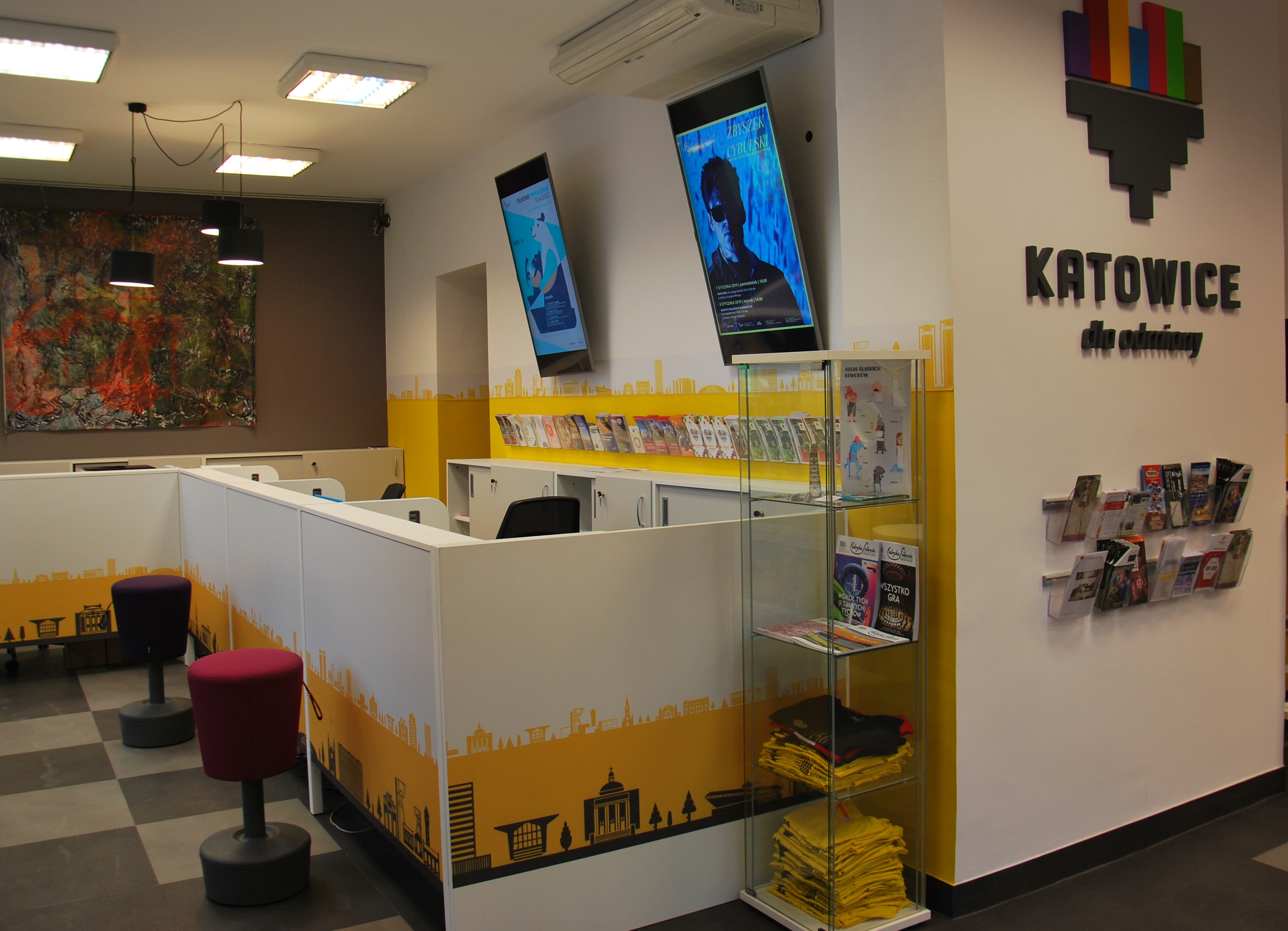 Informacja turystyczna mieści się na Rynku można w niej także uzyskać materiały dotyczące celów i kierunków rozwoju miasta, tras turystycznych, zabytków, ekspozycji muzealnych oraz ważnych kongresów, zjazdów i konferencji naukowych organizowanych w Katowicach. Można bezpłatnie wypożyczyć audioprzewodniki po centrum miasta oraz po szlaku architektury modernistycznej. Zainteresowani mogą skorzystać z papierowej wersji "Co, Gdzie, Kiedy w Katowicach", czyli tygodniowej rozpiski wydarzeń w regionie. Dostępne jest jedno stanowisko komputerowe z łączem internetowym, można skorzystać także z usługi ksero i wydruku z nośnika.